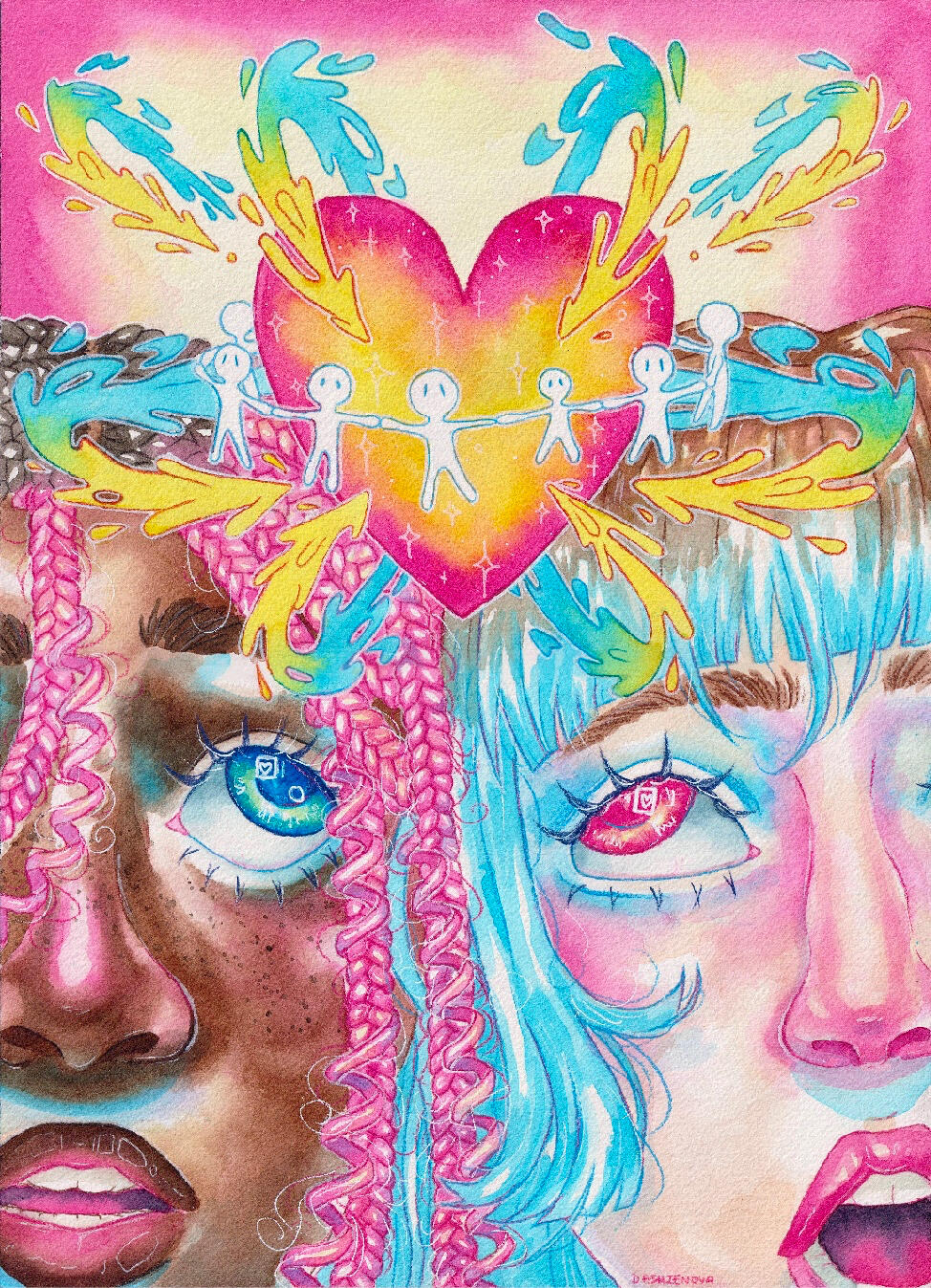 Hi there! I'm DASHIENOVA, a 21 year old artist from the UK. (Drawing of my representative character above!)I’ve made my debut as an illustrator/fine artist focusing mainly on watercolours and digital art. I make prints of my art, as well as badges, stickers and more, which I sell at conventions. My paintings are also in gallery exhibitions around the UK.Things I enjoy, and often focus my artwork on, are nature, diversity/human variety, disability, queerness, and surrealism. I share my work on social media too (mostly Instagram).I hope you enjoy your visit on my website!