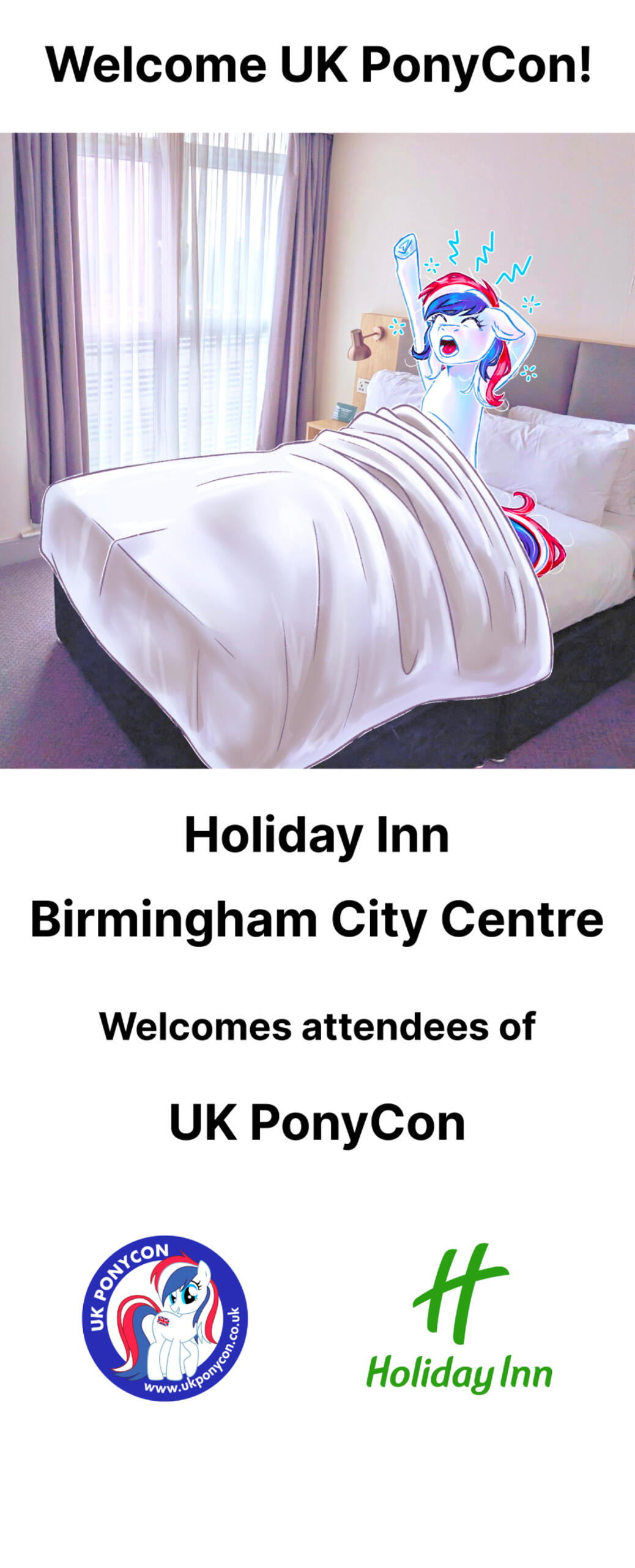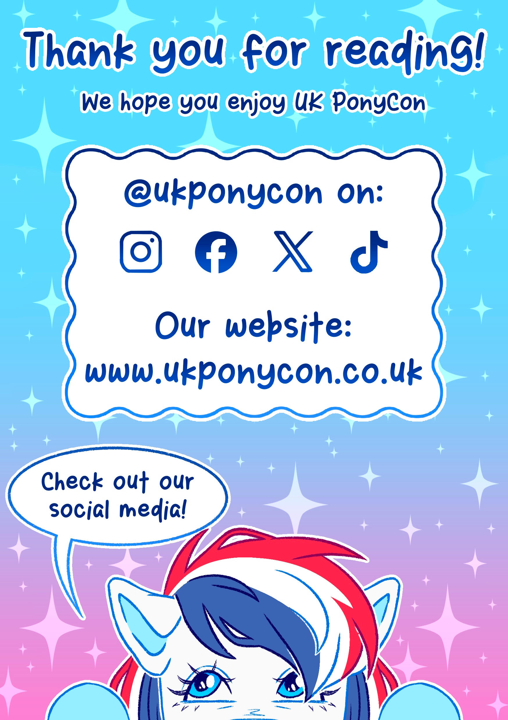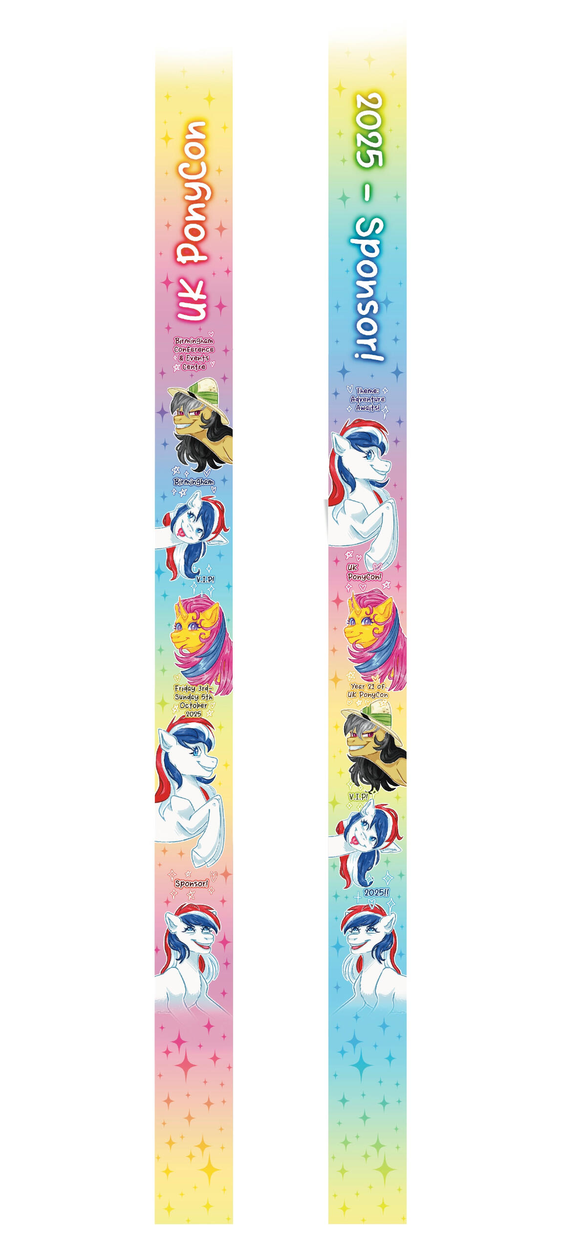 I am a member of the UK PonyCon art committee where I create artwork for the convention. Below is some of the pieces.From left to right: a banner fitting the 2025 theme (sold for £150 at charity auction), a banner for the hotel the con partnered with which was displayed in the lobby, a banner for the entrance to the main (mane) stage, 2025 gold sponsor lanyards, 2025 convention book front cover, and finally the back cover.